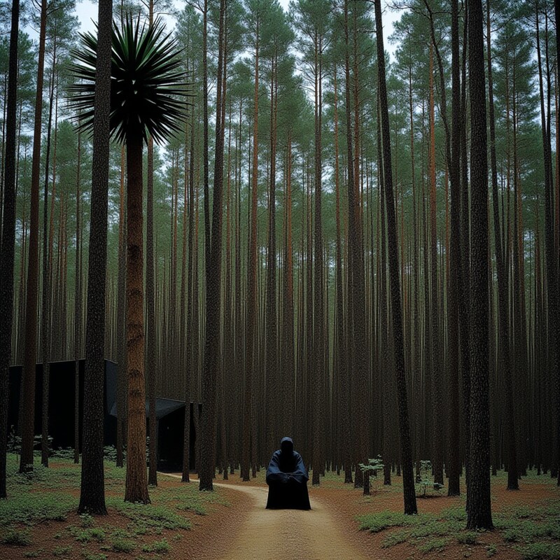 A figure in black sits quietly on a path among tall trees in a dense forest, immersed in contemplation during a calm moment.