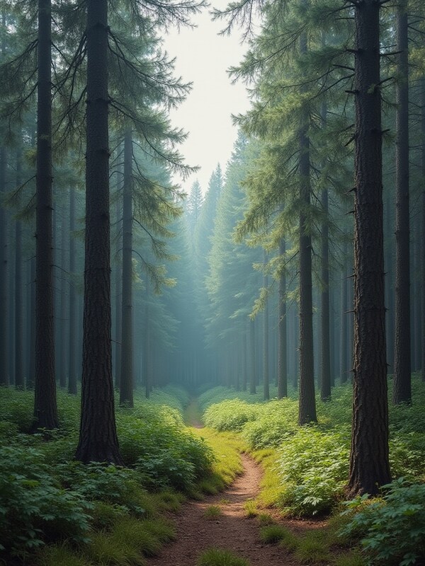 A serene forest path winds through tall trees, shrouded in morning mist. Sunlight filters softly, illuminating vibrant green foliage along the trail.