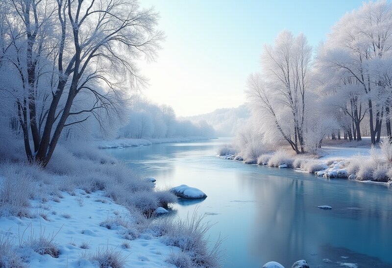 A serene river flows gently through a snowy landscape, surrounded by frosted trees glistening under soft winter light.