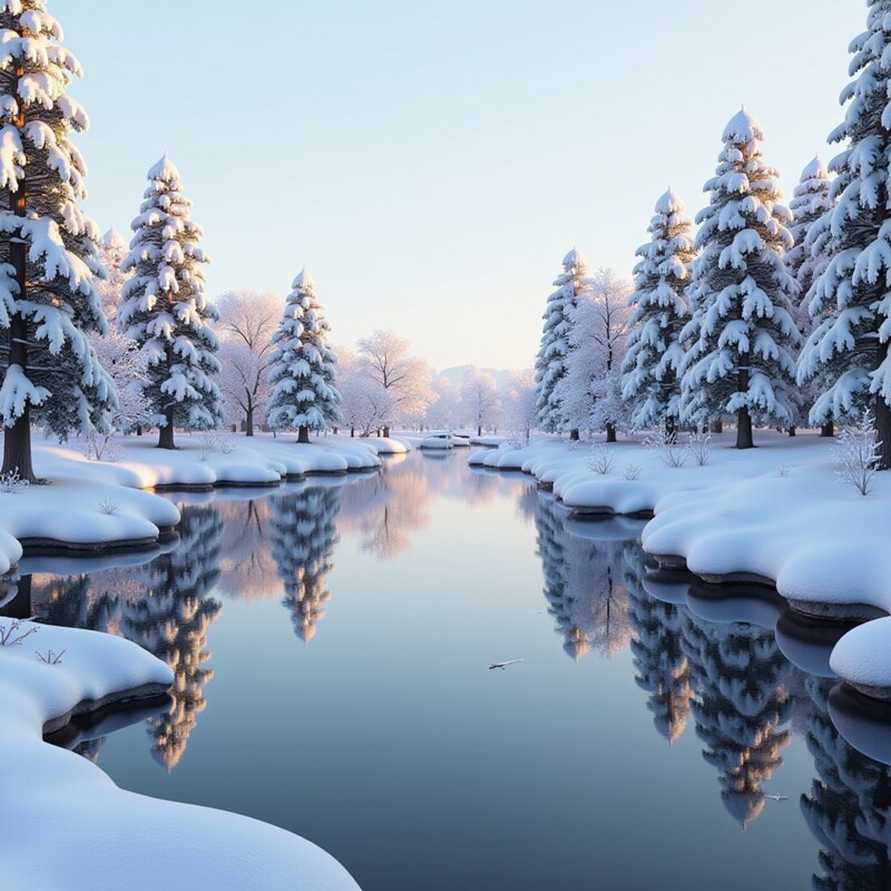 A serene winter landscape features snow-covered trees and calm water reflecting the clear sky. Soft light enhances the peaceful atmosphere.