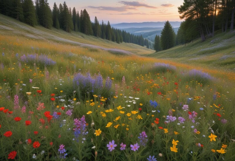 Colorful wildflowers bloom across a quiet meadow with tall green grass, set against a backdrop of mountains and a soft sunset sky.