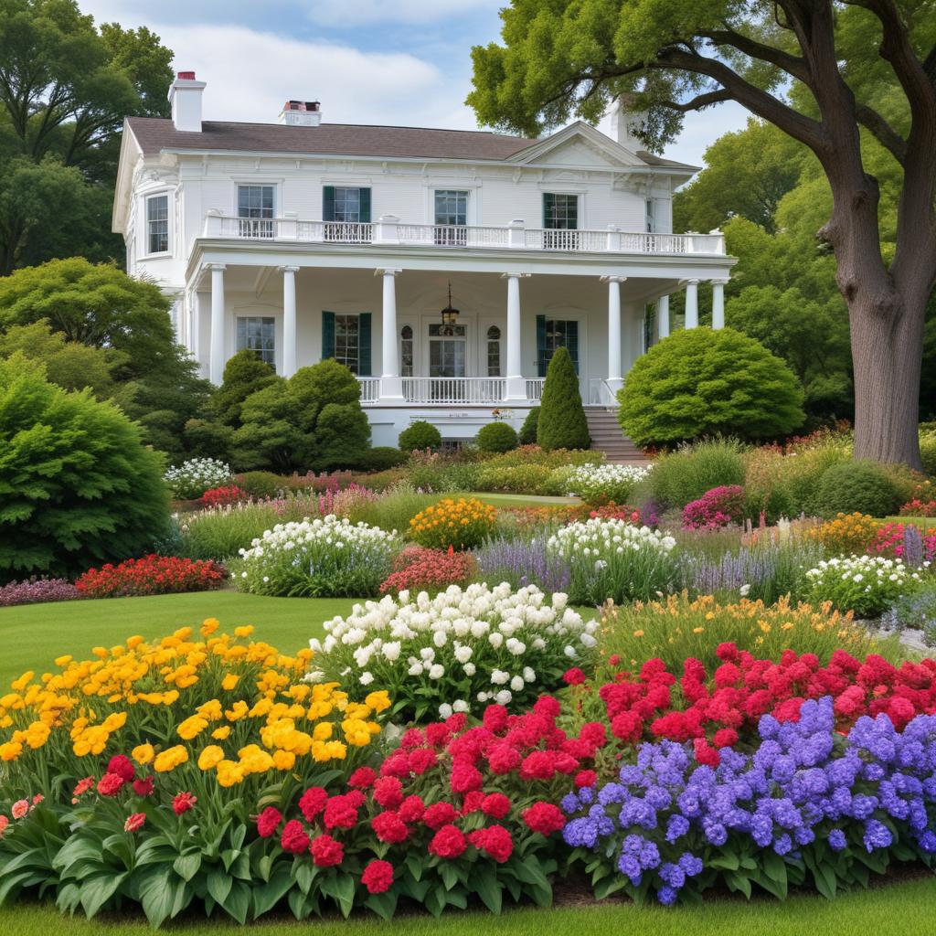 A beautiful white house surrounded by vibrant flowers in full bloom, showcasing a carefully landscaped garden in springtime.