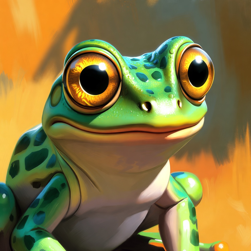 Bright green frog with large eyes sits calmly on a surface with a warm orange background, showcasing its vibrant colors and details.