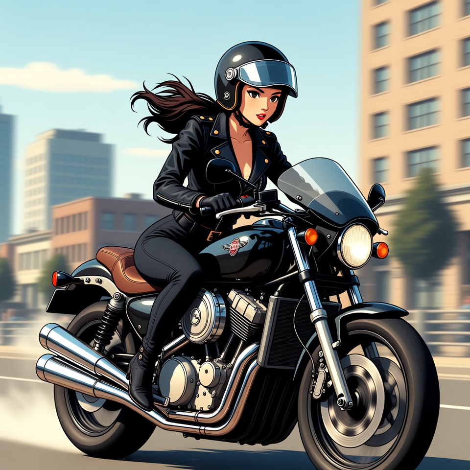 A confident woman rides a motorcycle through a city, wearing a leather jacket and helmet, enjoying the thrill of the ride.