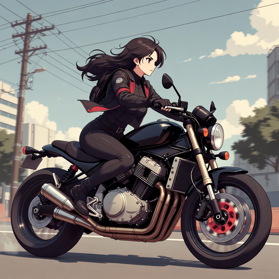 A woman in black gear rides a sleek motorcycle through an urban area, surrounded by buildings and trees on a sunny day.