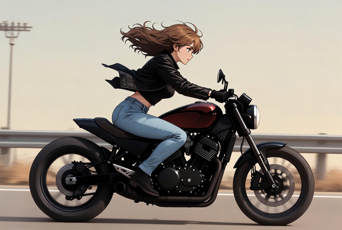 A young woman rides her motorcycle along a highway. Her hair flows in the wind while she wears a black jacket and jeans.