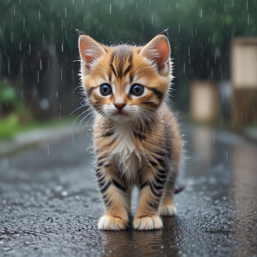 A small, fluffy kitten stands on a wet road, surrounded by falling rain. Its curious eyes look up, exploring the wet surroundings.