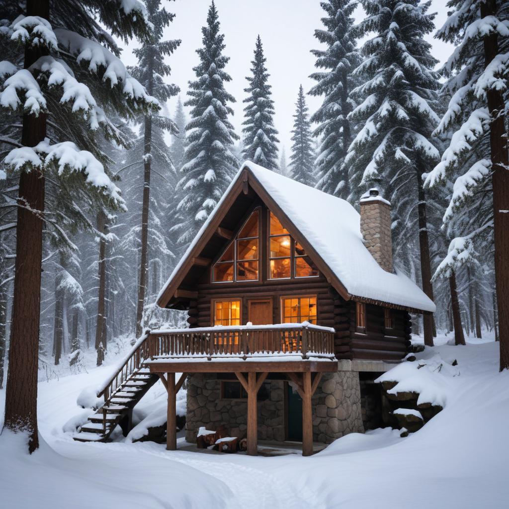 Snow blankets a charming cabin nestled in a tranquil forest. Warm light glows from the windows, inviting coziness on a chilly day.