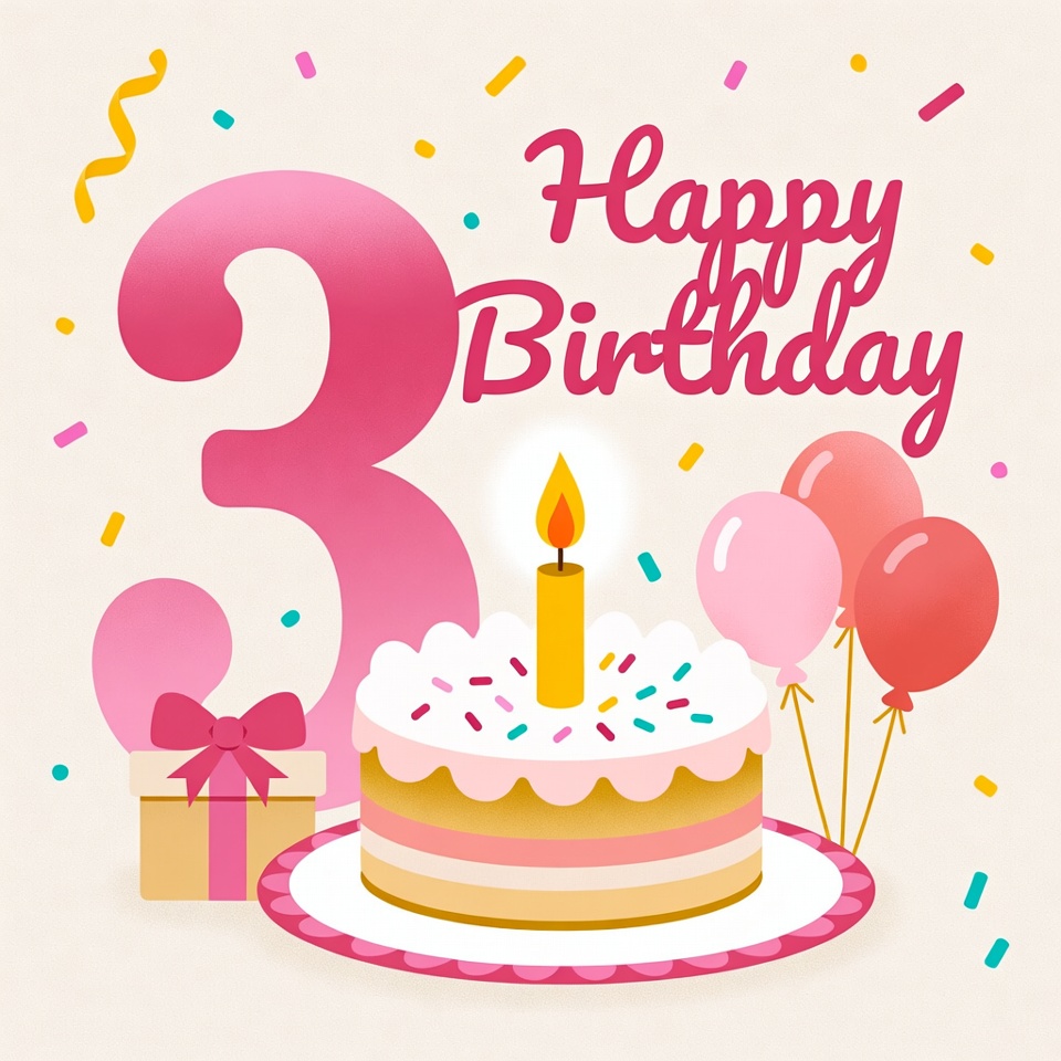 Colorful decorations highlight a birthday scene featuring a cake with a candle, balloons, and confetti for a joyful celebration of turning three.