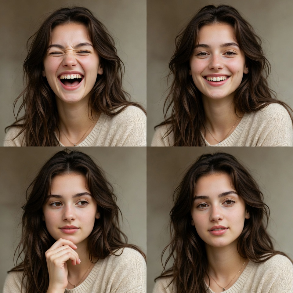 A young woman displays a range of emotions, from laughter to thoughtful reflection. Her warm expressions convey happiness and peace in a cozy setting.
