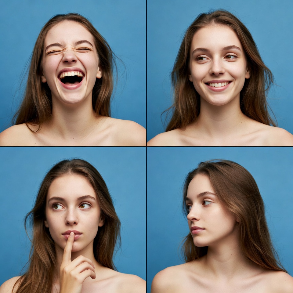 A young woman displays four facial expressions against a blue background. She laughs, smiles, shows contemplation, and considers thoughtfully.