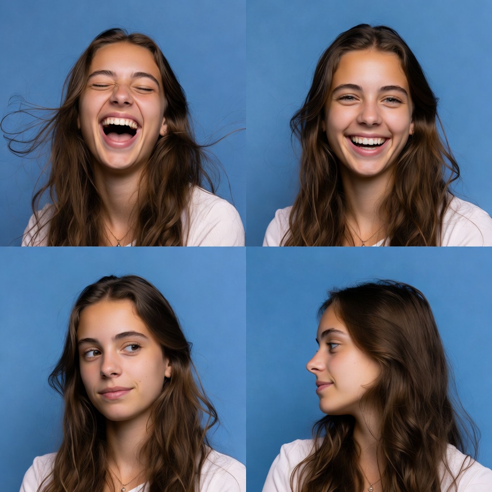 A girl showcases various joyful expressions against a blue background. Her long hair moves playfully with her laughter and smile.