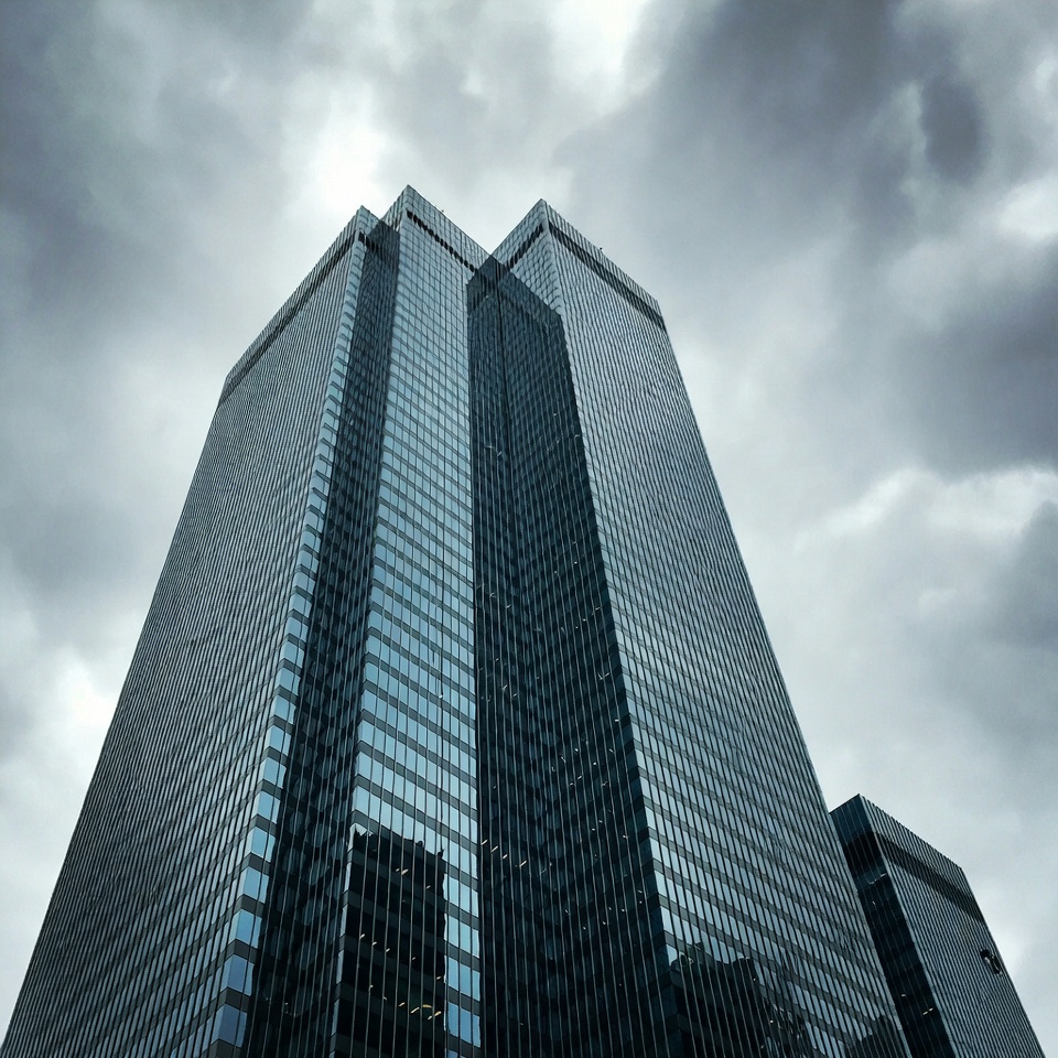 Tall glass skyscrapers rise against a dramatic, cloudy sky, reflecting the dark clouds and creating a striking urban scene.