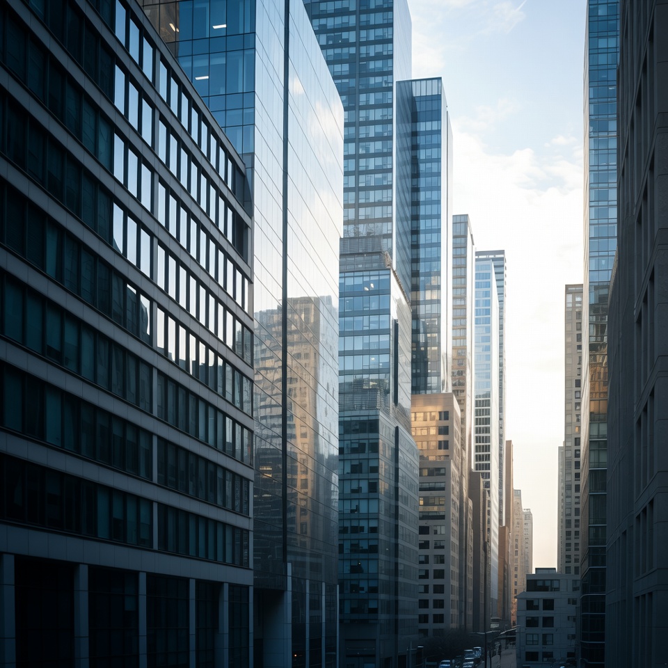 Tall glass buildings reflect the soft light of dusk in an urban setting, creating a blend of architecture and evening serenity.