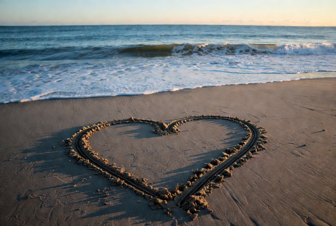 A heart shape is drawn in the sand near the shoreline as gentle waves approach at sunset. The scene captures a moment of love and tranquility.