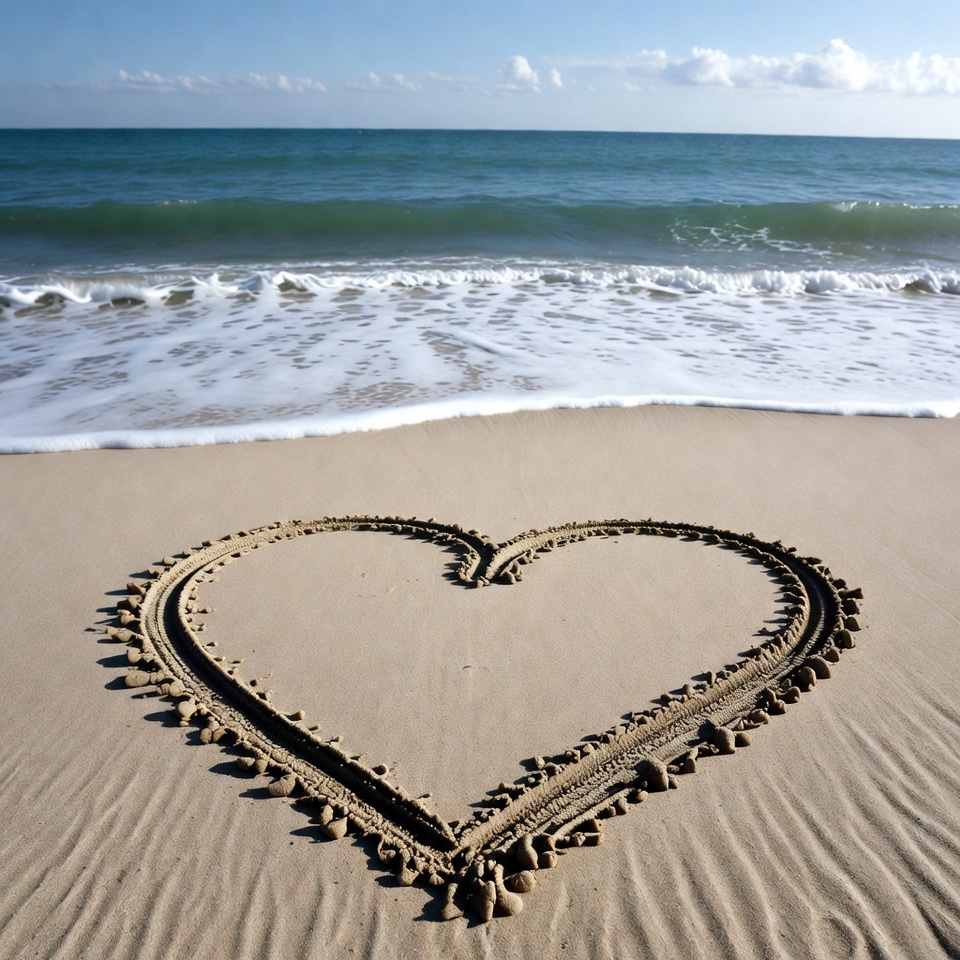 Waves gently lap at the shore as a heart shape is drawn in wet sand. Bright sunlight illuminates the calm sea in the distance.
