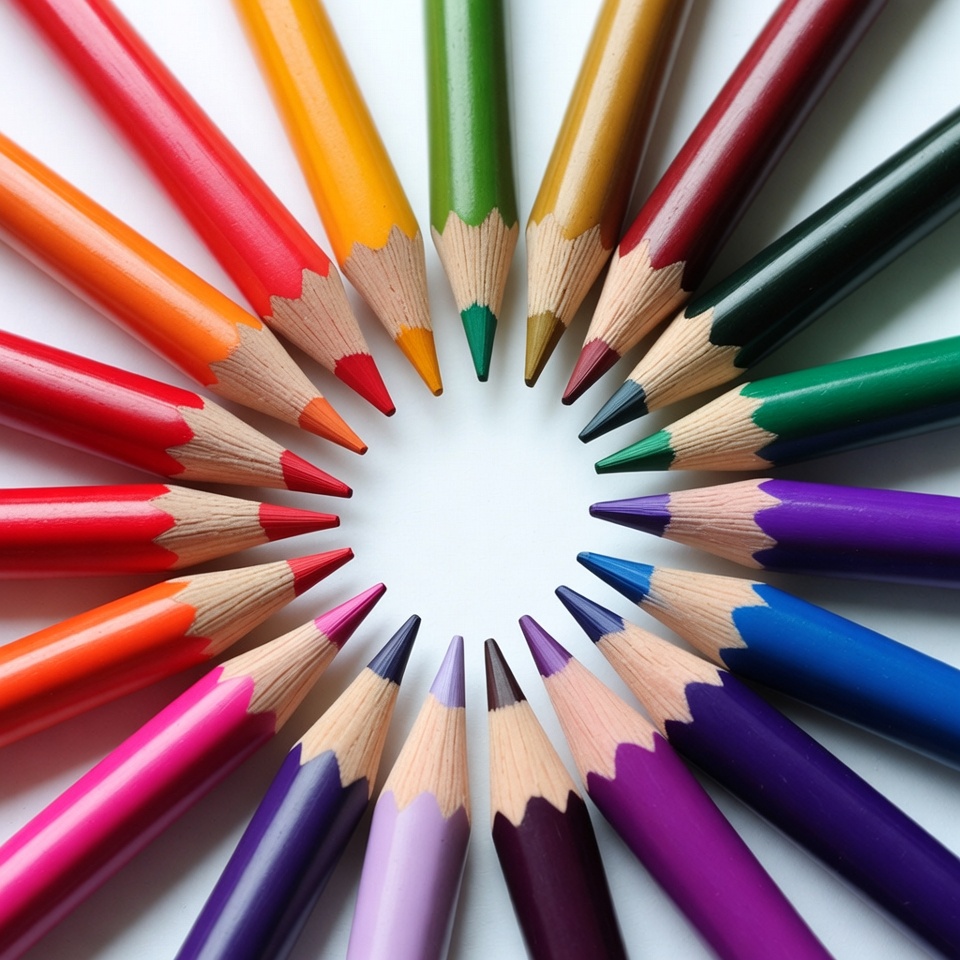Vibrant colored pencils are neatly arranged in a circular pattern on a white surface, showcasing a spectrum of colors.