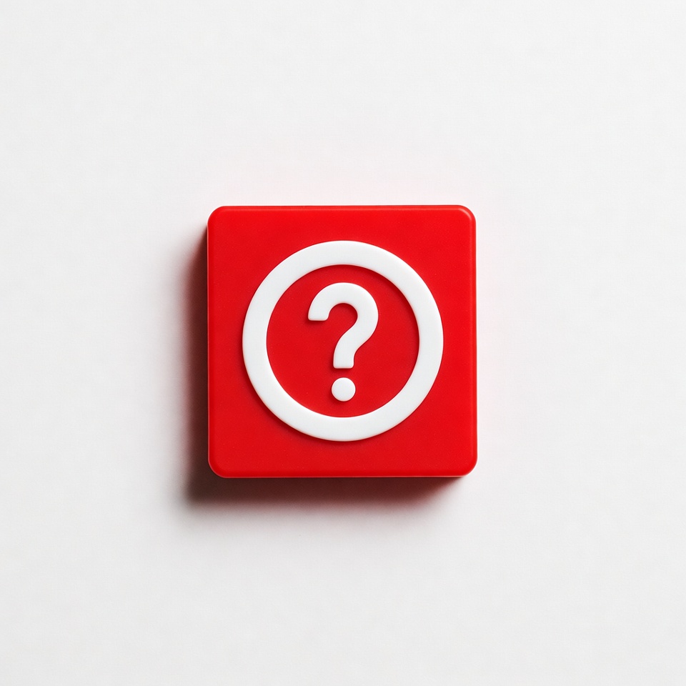 A white question mark symbol is centered on a bright red square. The design is simple and bold, emphasizing curiosity and inquiry.