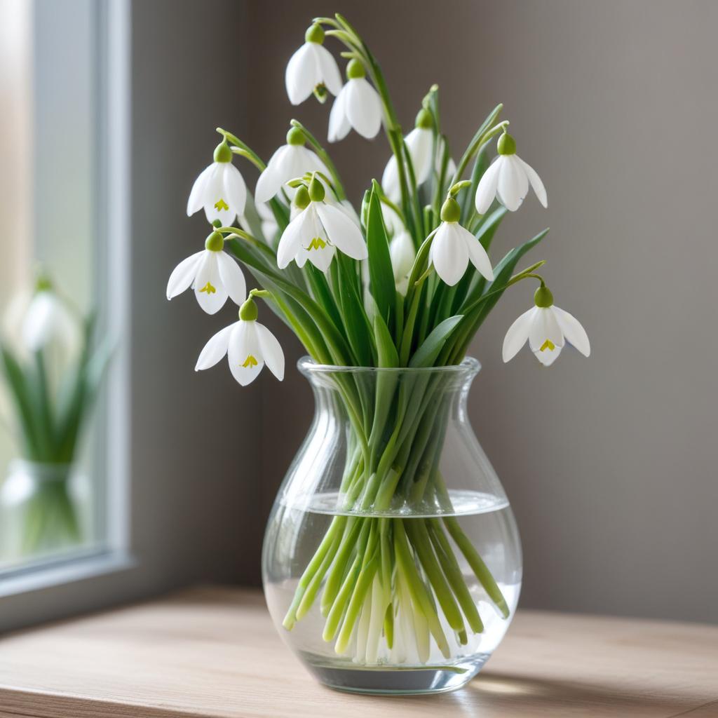 A clear glass vase holds vibrant snowdrop flowers. Their delicate white petals and green stems brighten a cozy room, near a sunny window.