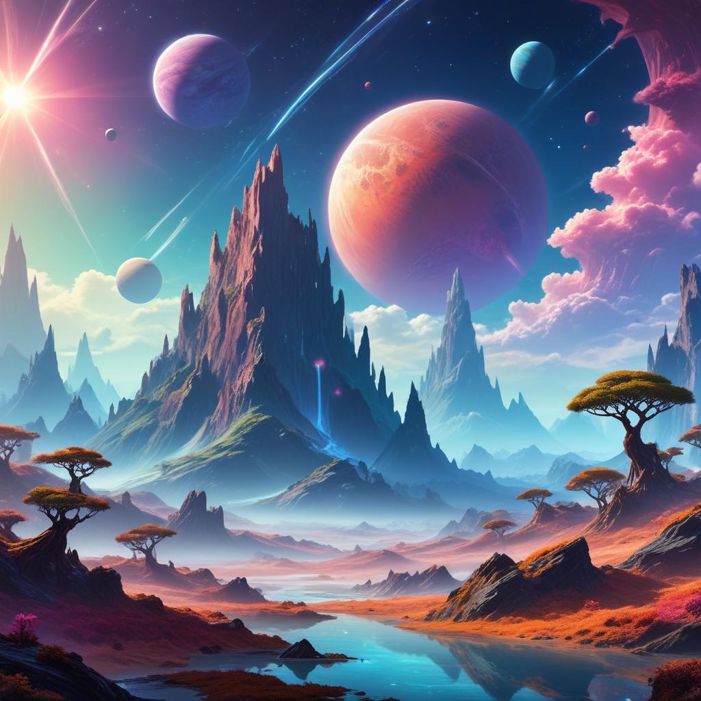 A stunning view of towering mountains under a vibrant sky with planets and stars. A serene river flows through the colorful scenery.