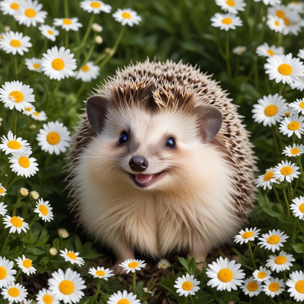 A small, joyful hedgehog sits in a vibrant garden filled with daisies, surrounded by green leaves, evoking a peaceful spring atmosphere.