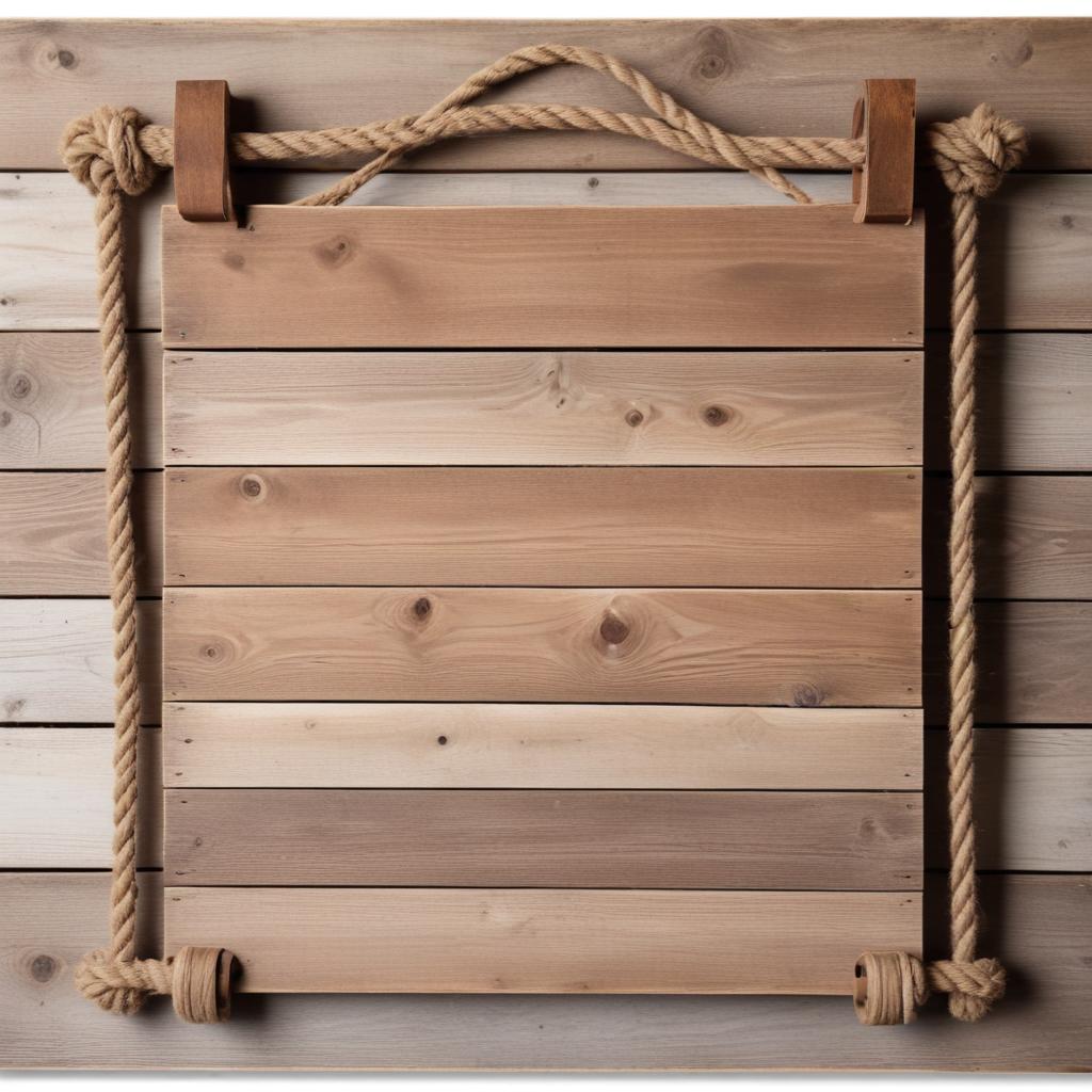A wooden sign made from multiple planks appears suspended by rope. The natural wood tones create a warm, rustic feel suitable for various displays.