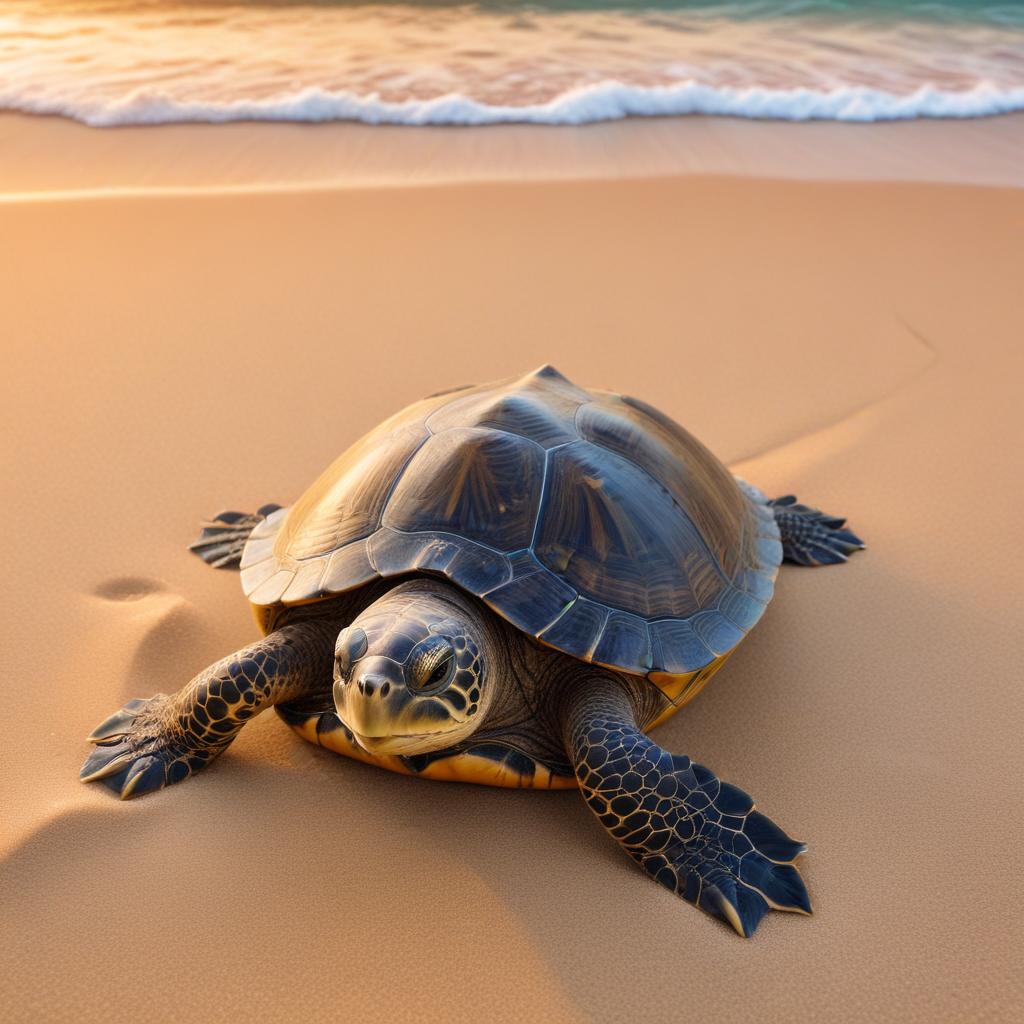 A turtle slowly moves across a sandy beach as the waves gently roll in during sunset, showcasing nature's serene beauty.