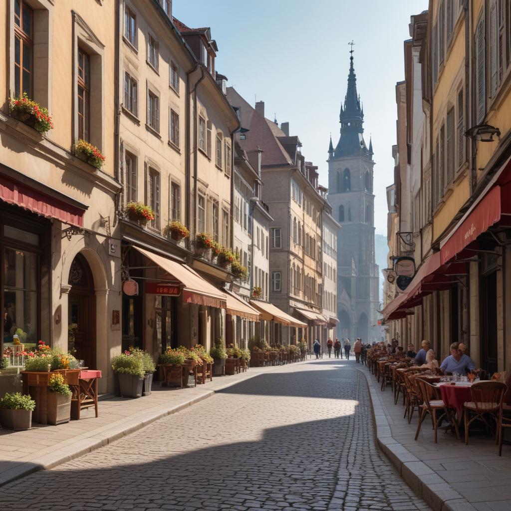 Europe, architecture, cafe, church tower, cobblestone pavement, dining, flowers, historic building, leisure, locals, morning, outdoor seating, pedestrians, restaurant, sightseeing, street, sunny day, town, travel, urban life