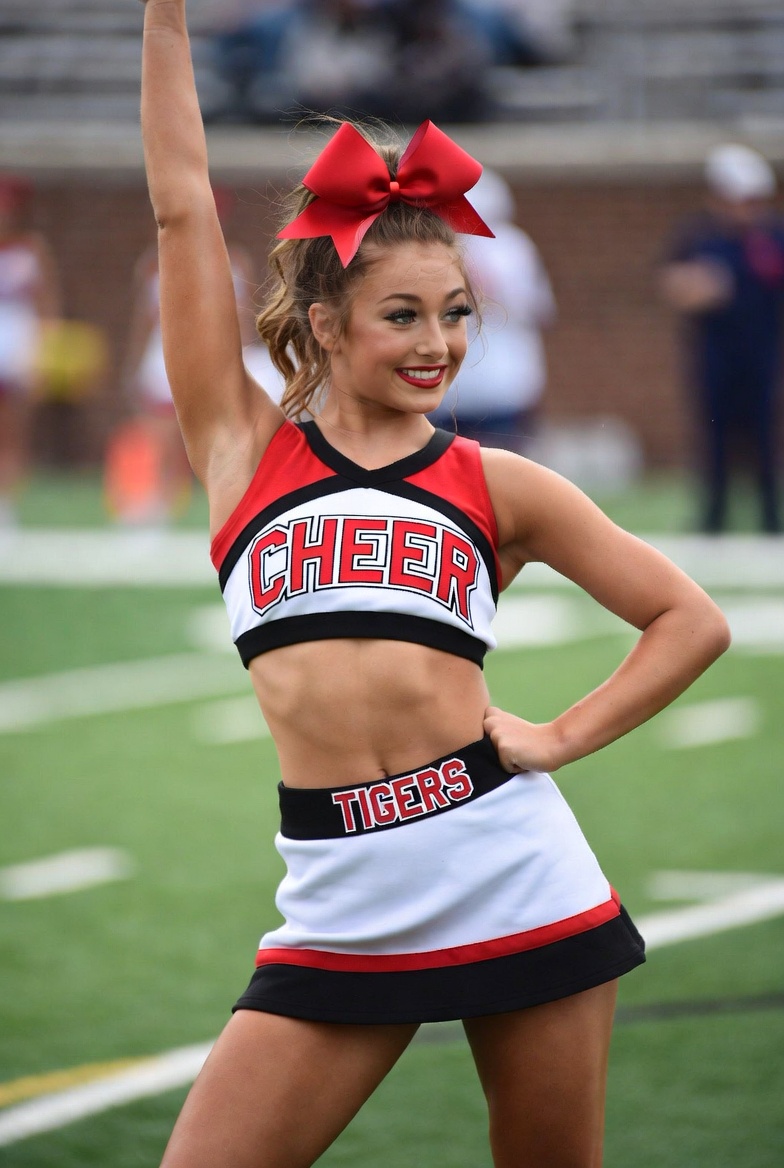 athletics, celebration, cheer, cheerleader, competition, crowd, dance, energy, event, excitement, field, football, game, outdoor, performance, school spirit, sports, team, uniform, youth