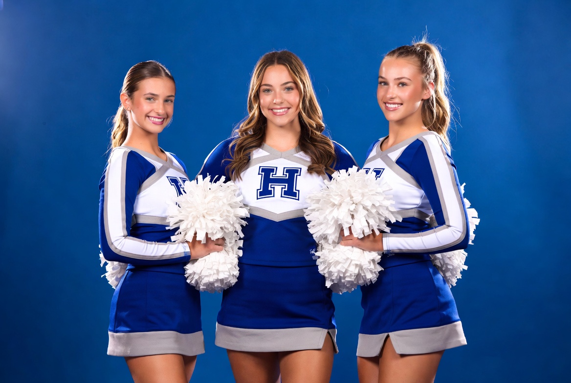 blue background, celebration, cheer attire, cheer squad, cheerleaders, cheerleading routine, energetic, event, friendship, high school, high spirits, performance, pompoms, posing, positive energy, school spirit, smiling, team uniforms, teamwork, youth sports