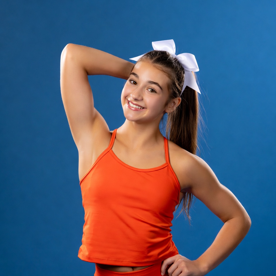 athletic, blue background, bow, cheerleader, cheerleading, confidence, energy, enthusiastic, fitness, girl, leisure, orange, playful, playful expression, pose, posing, smile, sportswear, team spirit, youth
