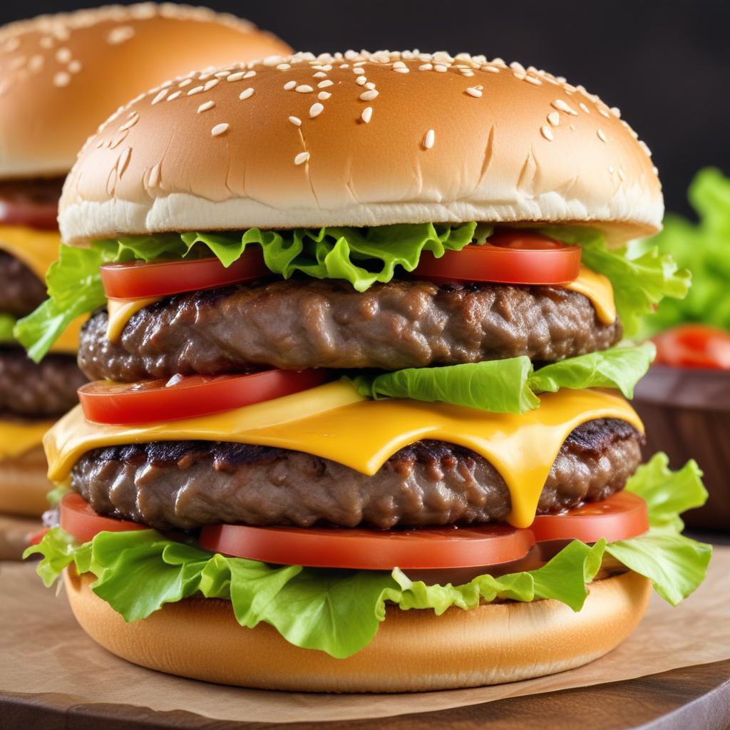 Two thick beef patties layered with melted cheese, lettuce, and tomatoes create a delicious double cheeseburger ready to enjoy.