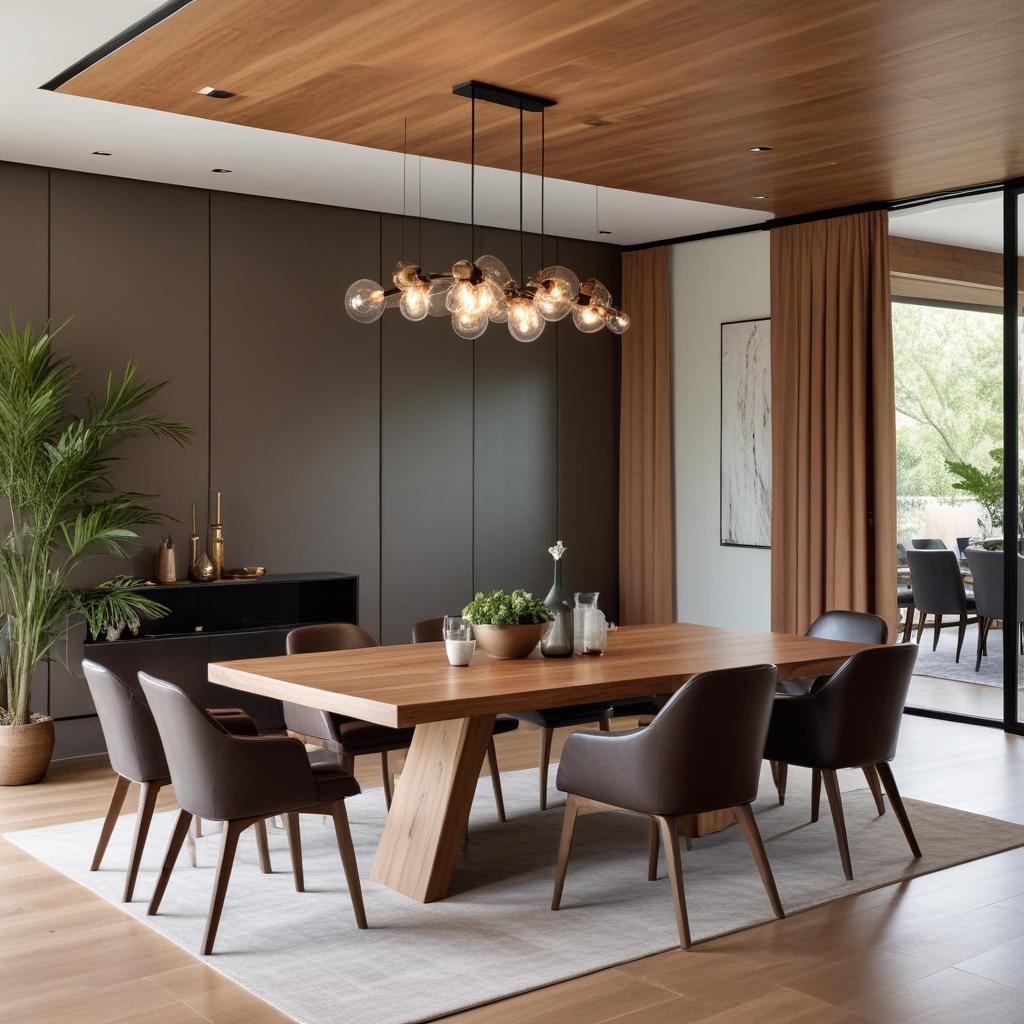 contemporary style, cozy ambiance, dining area, dining room, elegant chairs, entertaining, greenery, home design, home living, interior design, inviting setting, minimalist decor, modern decor, natural light, open layout, relaxing space, stylish furniture, unique lighting, warm atmosphere, wooden table