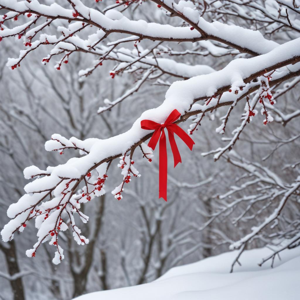 A snow-covered branch holds a bright red ribbon while soft snow blankets the ground. The scene is peaceful in a winter forest.