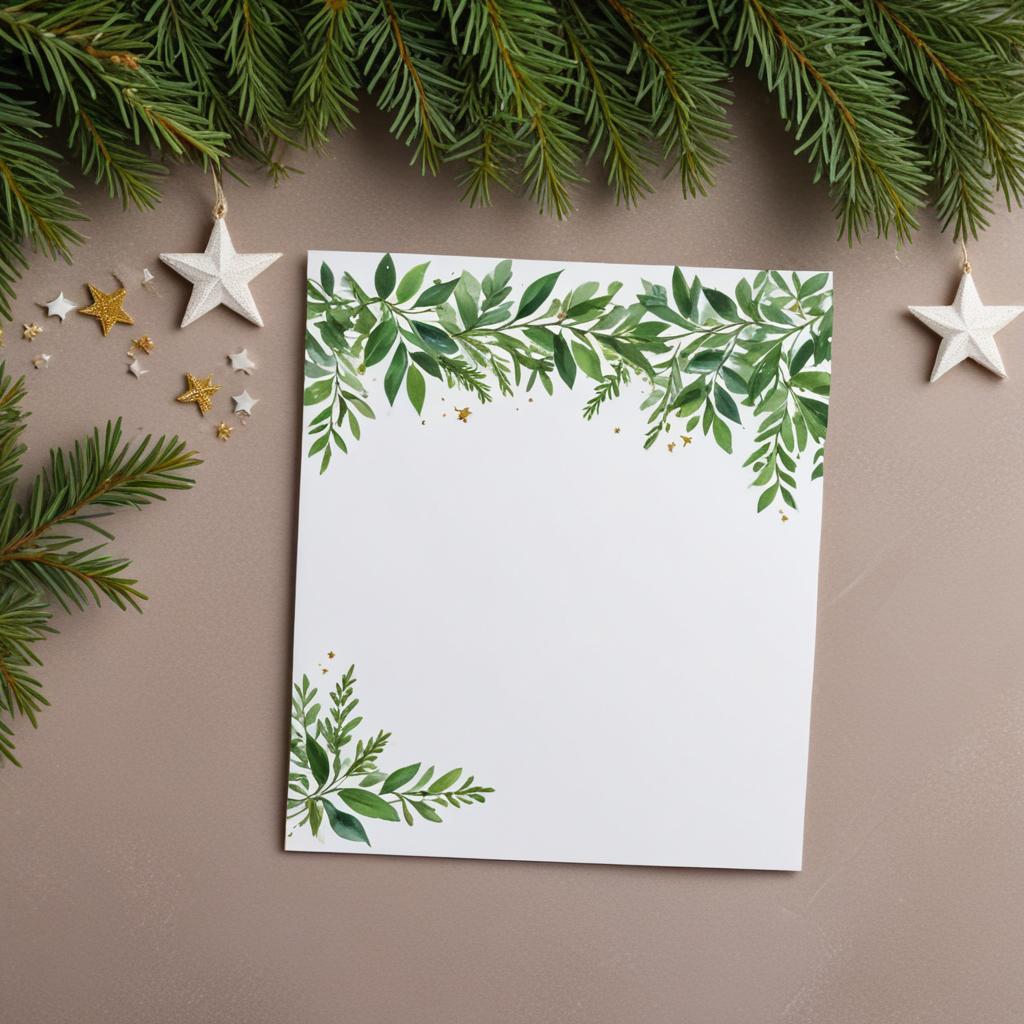 Plain stationery adorned with green leaves and stars, resting on a light surface surrounded by festive decorations, ready for writing.