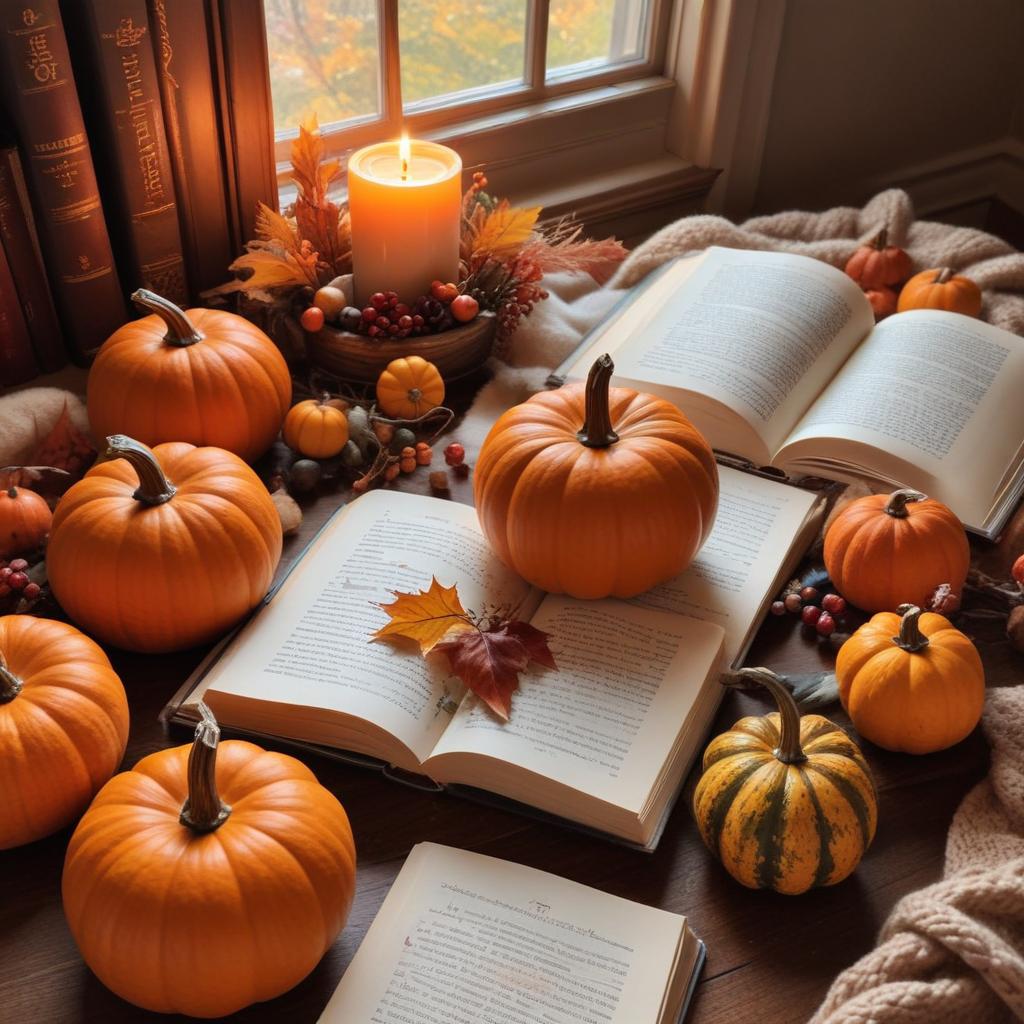 A warm ambiance fills the room with small pumpkins, open books, and a glowing candle. Fall leaves add to the seasonal charm by the window.