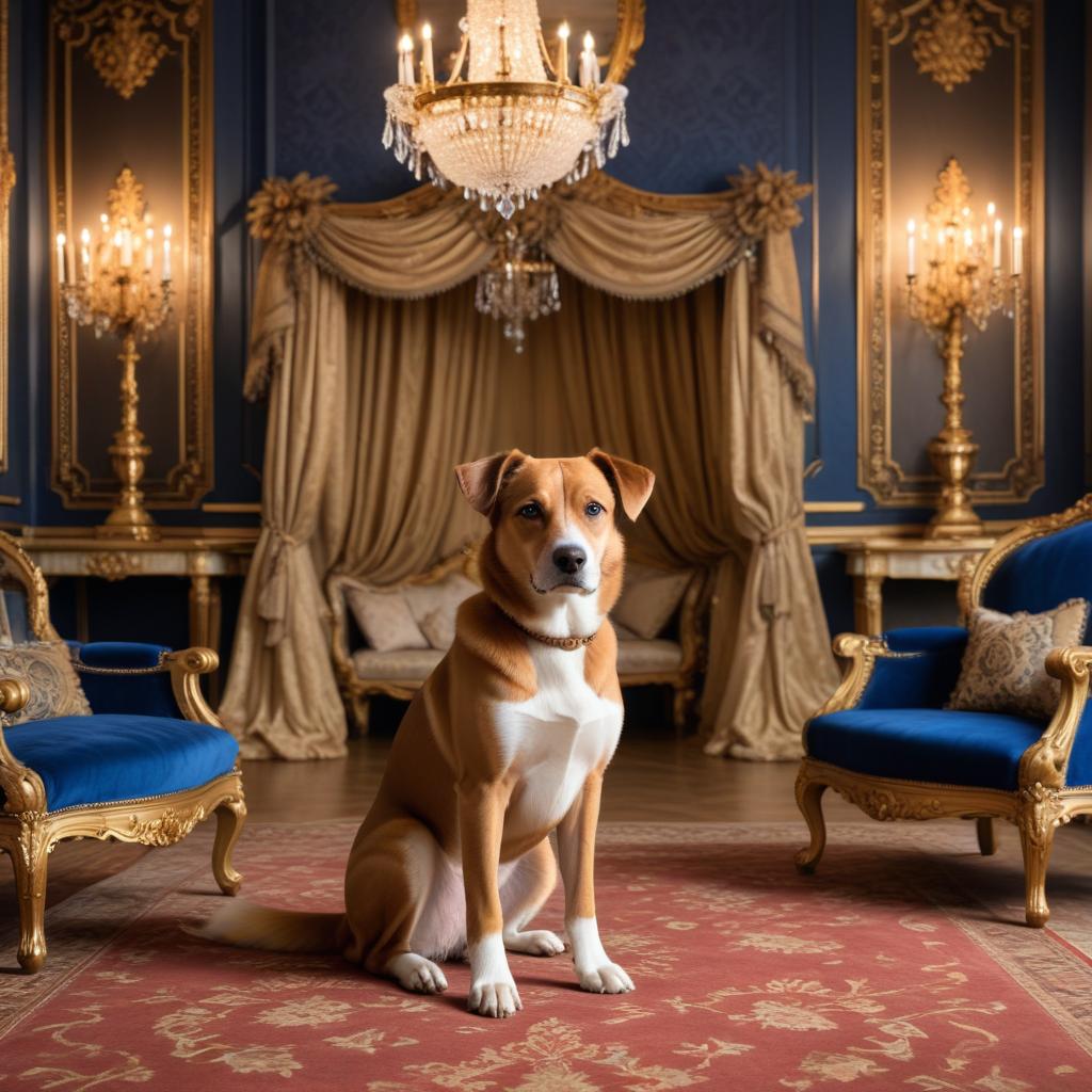 A dog sits proudly on a rug in an opulent room with golden decor and blue chairs. Chandeliers illuminate the elegant surroundings.