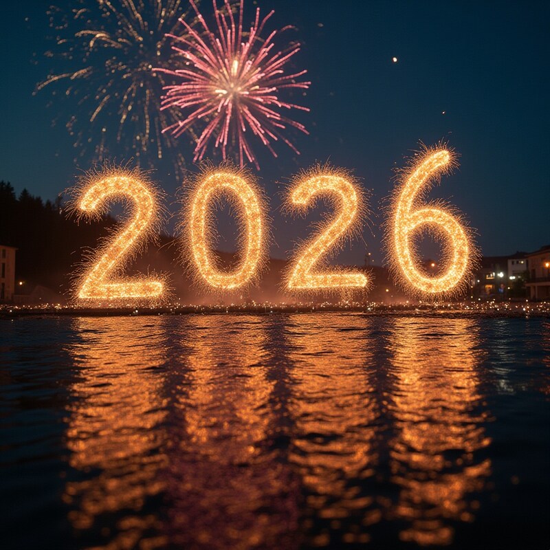 Bright fireworks light up the night sky as sparkling numbers 2026 are displayed over a tranquil water surface, marking a festive celebration.