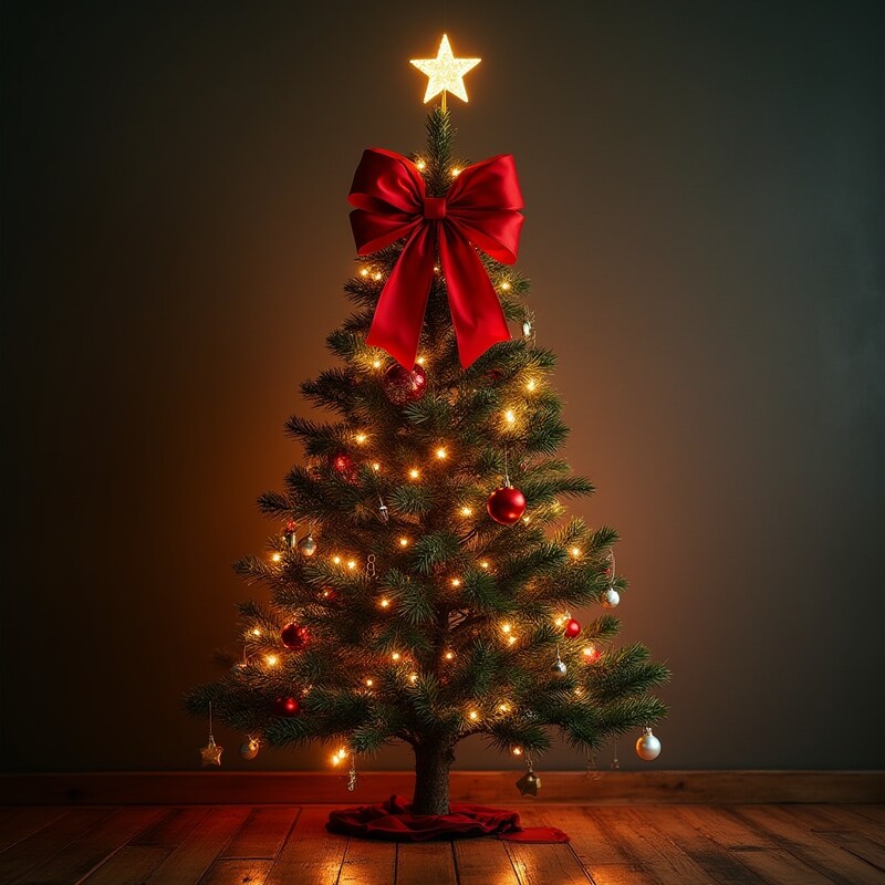 bow, celebration, cheer, christmas tree, cozy, decorations, family, festive, gathering, glowing, holiday, indoor, joy, lights, ornaments, pine, star, tradition, warmth, winter