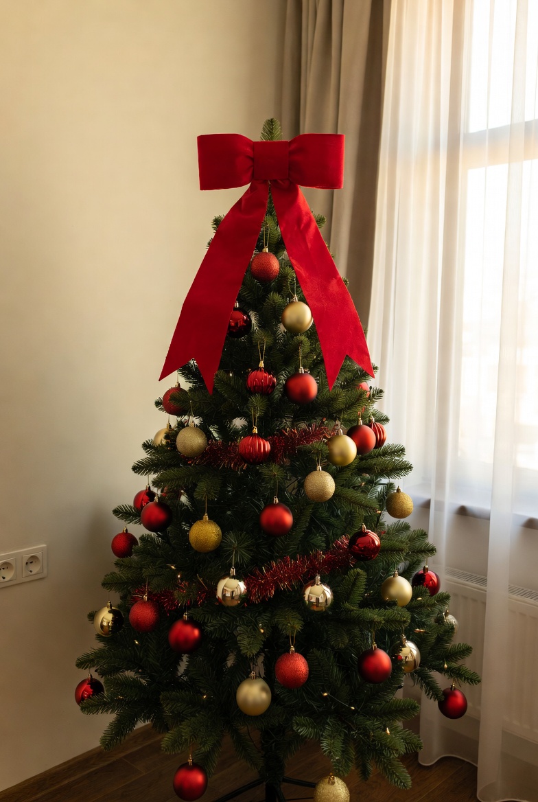 A beautifully decorated Christmas tree stands in a cozy room. Glittering ornaments in red and gold adorn the branches, topped with a big red bow.