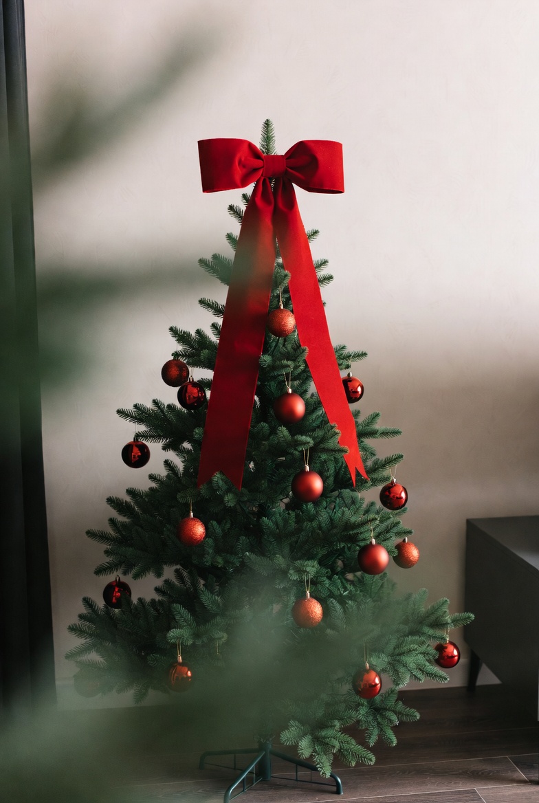 A festive Christmas tree stands elegantly decorated with red ornaments and a large red bow atop, creating a warm holiday atmosphere.