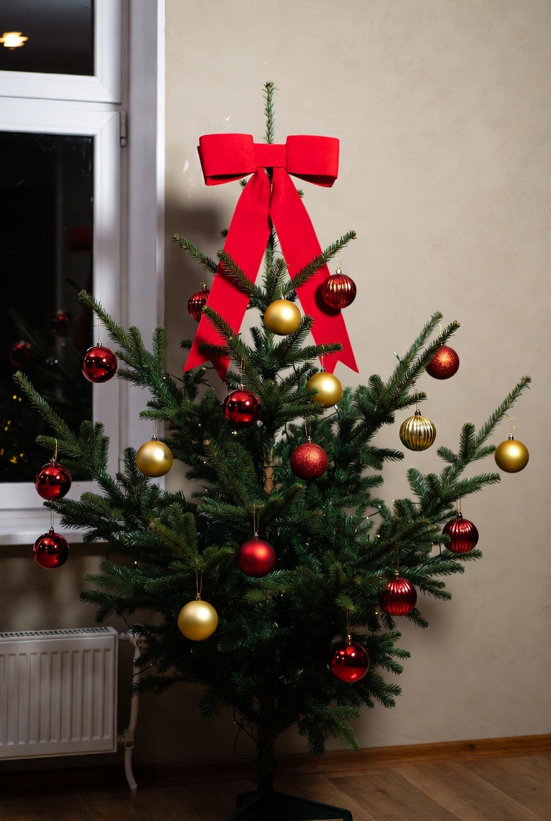 celebration, cheer, christmas, cozy, decoration, event, family, festive, gathering, gold, green, holiday, indoors, joy, ornaments, red bow, room, seasonal, tree, winter