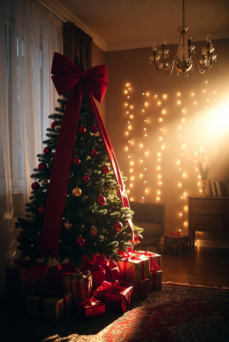 celebration, christmas tree, cozy room, evening, fairy lights, family gathering, festive atmosphere, gifts, holiday decorations, home decor, indoor scene, living room, ornaments, pine tree, presents, red ribbon, seasonal, twinkling lights, warm lighting, winter celebration
