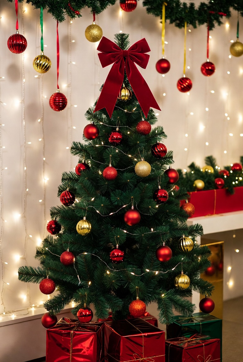 A Christmas tree decked with red and gold ornaments shines amidst twinkling lights and colorful gifts, spreading holiday cheer.