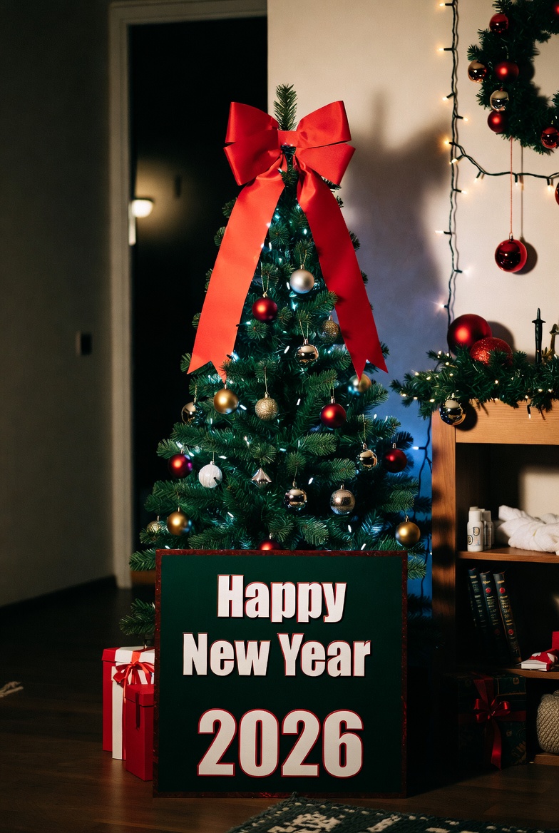 A beautifully decorated Christmas tree stands beside festive gifts, celebrating New Year 2026 with vibrant colors and holiday cheer.