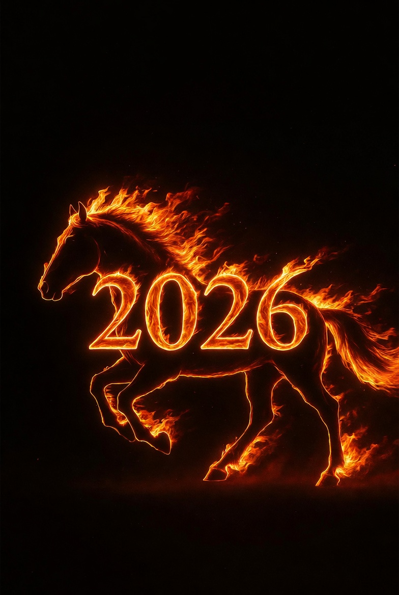 A glowing horse silhouette runs with flames, symbolizing the year 2026. The scene is dark, highlighting the fiery design.