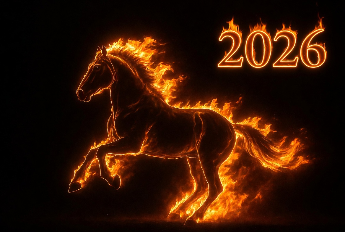 A horse made of flames leaps forward, representing strength and energy. The year 2026 glows brightly beside it, signifying a turning point.