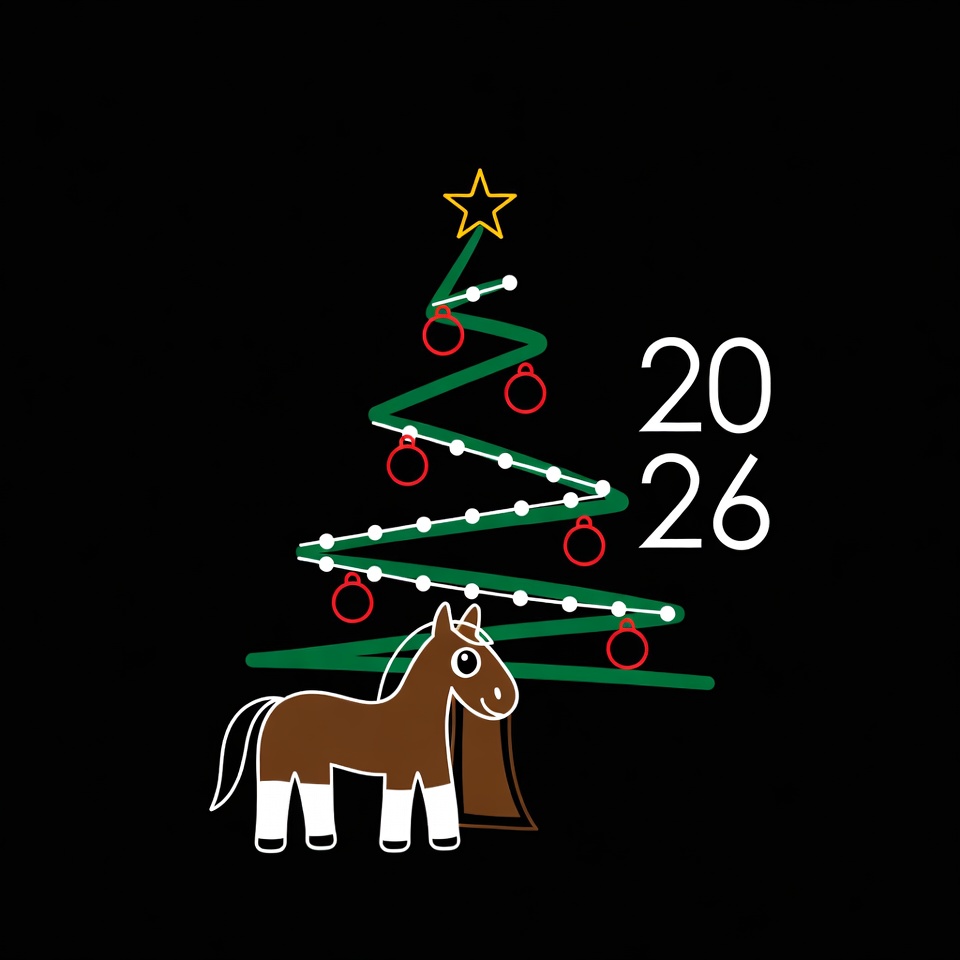 A festive drawing features a stylized Christmas tree with ornaments, topped with a star, alongside a brown horse. Perfect for holiday cheer.