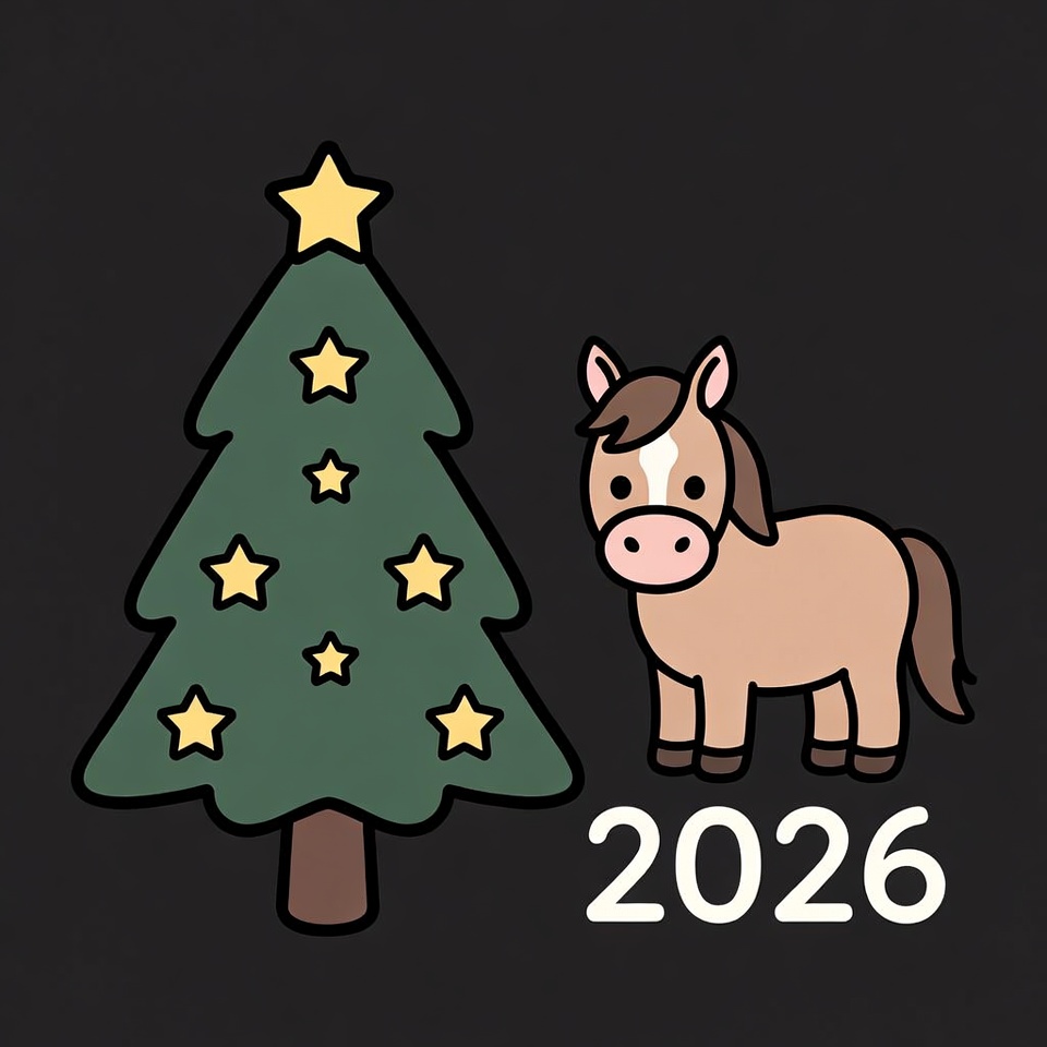 2026, Christmas, animal, art, brown, celebration, character, cute, decoration, design, event, festive, green, holiday, horse, joy, seasonal, stars, tree, winter