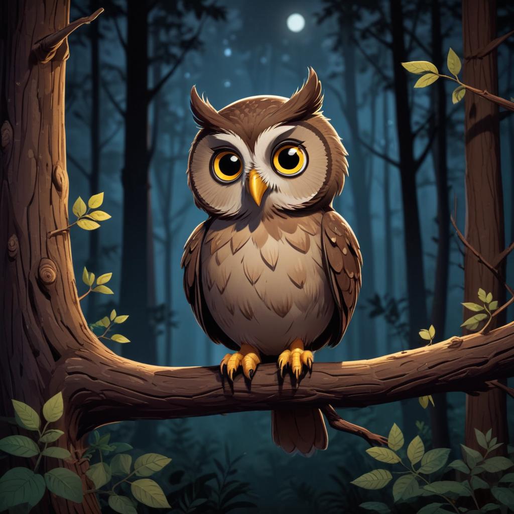 A wise owl sits on a tree branch in a dark forest. The moonlight filters through the trees, creating a serene nighttime scene.